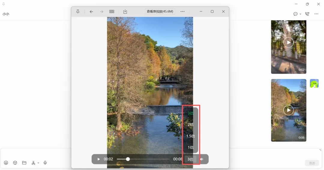 电脑端微信还支持视频倍速播放。点点就能快速切换,倍速获取重点信息,不用再拖进度条。